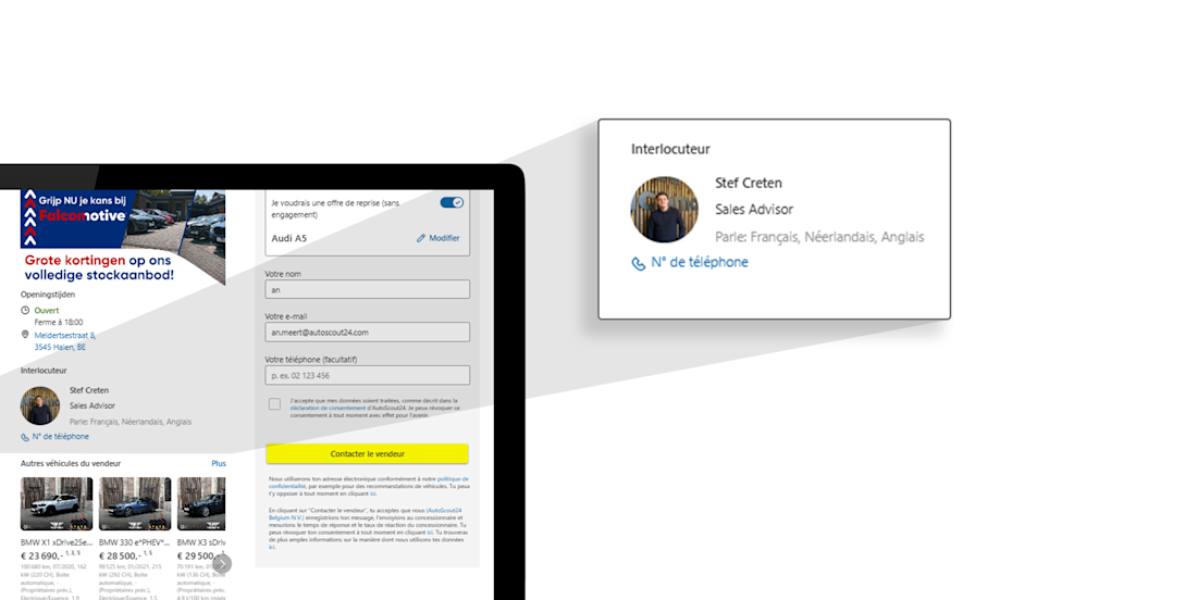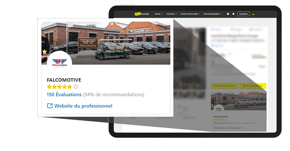 Avec AutoScout24 à vos côtés, vous êtes déjà bien positionné pour la gestion de votre image. AutoScout24 vous offre de nouvelles solutions qui vous permettent de créer facilement une image de confiance pour votre entreprise. Vous renforcez ainsi la confiance que les clients vous accordent en tant que professionnel de l'automobile.