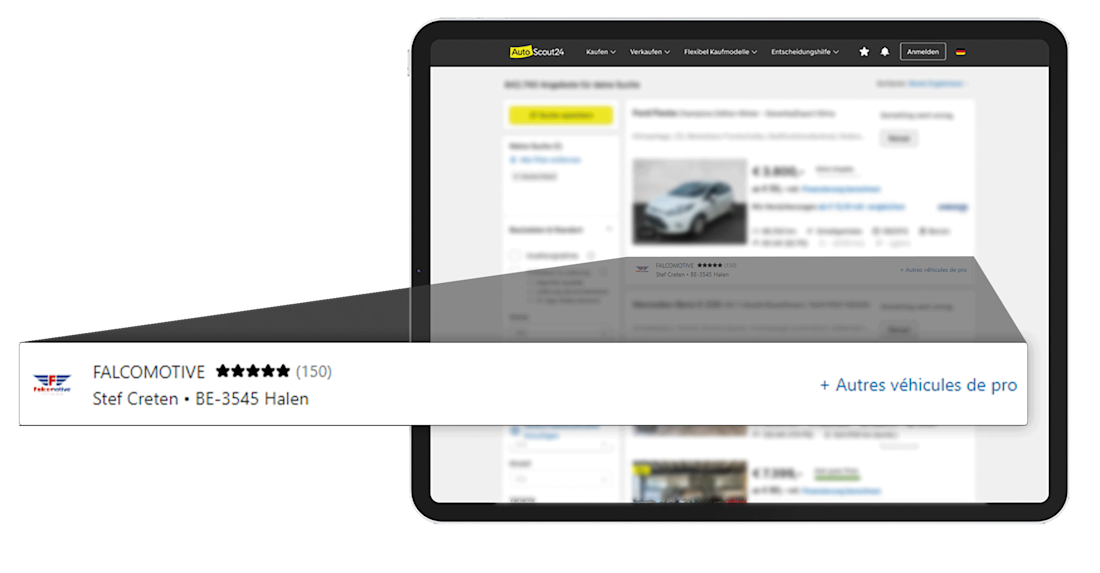 Sur AutoScout24, le premier contact entre l‘acheteur et vous a lieu dans la liste des résultats de recherche. Faites-vous connaître de manière professionnelle avec votre logo, vos évaluations et montrez la diversité de votre stock.