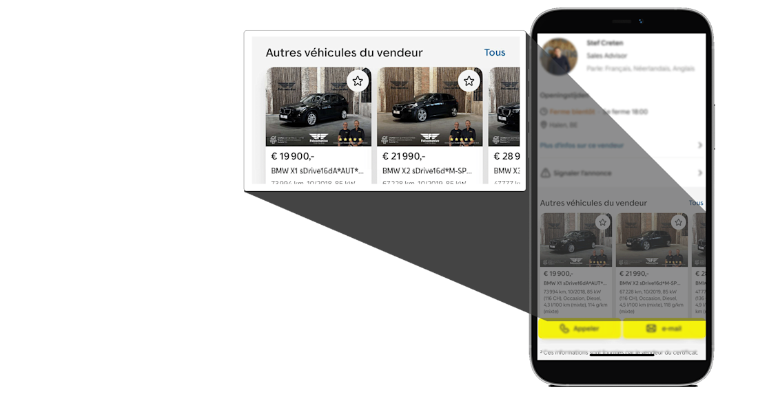 Avec le lien direct vers votre propre site, vous reliez vos annonces AutoScout24 à votre site internet. Vous associez ainsi la réputation d‘AutoScout24 à votre marque et augmentez la confiance de vos clients.