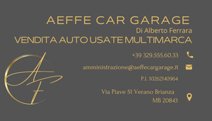 Horaires d'ouvertureDopo 10 anni di collaborazioni con varie concessionarie della provincia di Monza e Brianza e più di 2000 vetture vendute, dal Gennaio 2024, Alberto apre la propria attività indipendente : la Aeffe Car Garage di Alberto Ferrara. Sita in Verano Brianza Via Piave 51, vanta di un Capannone cosi suddiviso: Ufficio climatizzato per poter ricevere comodamente i clienti Zona preparazione Detailing Zona per fotografare le vetture con Ampio Logo in vista Zona posteggi vetture il tutto protetto da antifurto con telecamere e fotocamere e sensori di movimento. Esperto in Detailing dell'auto, cerca di dare il massimo servizio al cliente con possibilità di consegna della vettura presso la residenza. Garanzie di conformità e contratto stipulati con firma elettronica Otp. Le automobili sono visibili previo appuntamento telefonico al 329.555.60.33 oppure alla mail : amministrazione@aeffecargarage.it