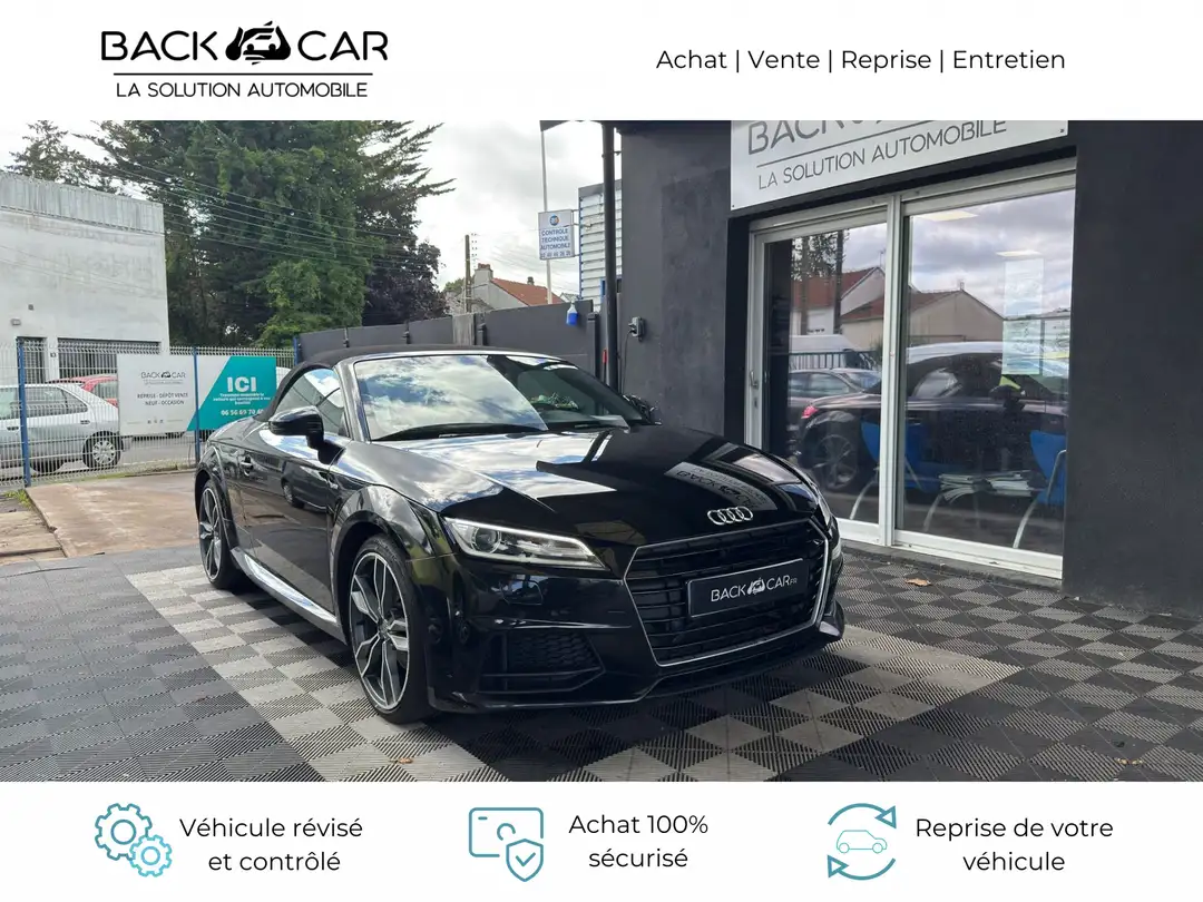 Equipements supplémentaires : Acces a la commande vocale du Smartphone, Affichage du controle de pression des pneumatiques, Aileron AR telescopique a commande automatique ou manuelle par bouton, Airbags grand volume conducteur et passager AV, Airbags lateraux AV, Antipatinage electronique ASR, Applications decoratives en aluminium brosse mat, Appuis lombaires a 4 axes pour les sieges AV reglables electriquement, Arceaux de securite style aluminium derriere les appuis-tetes constituant une cellule protectrice, Assistant de freinage en cas de collision, Audi Active Lane Assist: Assistant de maintien de trajectoire, Audi drive select : avec mode Efficiency , permet differents reglages (direction, moteur et, Audi Music Interface, Audi Parking System: Signal acoustique d'aide au stationnement AR, Audi Singleframe avec encadrement chrome de la calandre, Audi Virtual Cockpit, Blocage electronique de differentiel EDS, Capote acoustique entierement automatique en noir ou gris ou beige en tissu isolant 3 couches noir, Carrosserie : architecture Audi Space Frame ASF, Ceintures de securite 3 points a enrouleurs a toutes les places avec pretensionneurs et limiteurs de, Chassis avec reglage sportif, Chassis Sport S line, Ciel de capote en tissu noir, Cle a frequence radio, Climatisation automatique Confort, Colonne de direction de securite complete le potentiel de protection des ceintures et des airbags, Colonne de direction reglable mecaniquement en hauteur et en profondeur, Console centrale, Controle electronique de stabilisation (ESC) avec blocage transversal electronique, Coupe-vent a commande electrique, Direction assistee electromecanique, Direction progressive, Eclairage interieur a LED avec spots de lecture, lumiere reflechie pour la console centrale, boite a, Embleme S-Line sur les ailes AV, Feux AR a LED avec feux de recul et feux AR de brouillard integres, Feux de freinage adaptatif avec declenchement automatique des feux de detresse, Fixations pour sieges enfants norme ISOFIX aux places laterales AR, Fonction audiostreaming, Frein de stationnement electromecanique, Habitacle tableau de bord et ciel de pavillon en noir avec surpiqures contrastees sur les selleries, Identification du modele, Interface Bluetooth, Lave-essuie-glace, Lecteur de carte SDXC supplementaire, Lunette AR degivrante, MMI Radio integre dans l'Audi Virtual Cockpit, MMI Touch, Moulures de seuils avec inscription S line, Moulures de seuils de portes avec inserts en aluminium, Navigation MMI Plus avec MMI Touch: Systeme de navigation, Oeilletons de fixation dans le coffre, Outillage de bord, Pack Aluminium Etendu, Pare-soleil rabattables et pivotants cote conducteur et passager AVavec miroir de courtoisie eclaire, Pommeau du levier/selecteur de vitesses en cuir perfore noir, Prise 12 V dans la console centrale AV, Protection antidemarrage electronique, Recherche MMI intelligente et complete par saisie de texte dans les menus, Recommandation de repos qui analyse le comportement routier au moyen de differents capteurs et, Recuperation d'energie lors des phases de freinage ou de deceleration permettant une economie de, Regulateur de vitesse, Retroviseur interieur jour et nuit automatique, Retroviseurs exterieurs avec clignotants a LED integre reglables electriquement avec miroir, Retroviseurs exterieurs electriques, escamotables, degivrants et buses de lave-glaces chauffantes, Sellerie S line en tissu Sequence/cuir en noir avec estampillage S sur le dossier des sieges AV, Set de reparation pour pneus, Sieges AV reglables en hauteur, Sieges AV Sport, Sorties d'echappement doubles avec embouts chromes, Style aluminium etendu a l'interieur avec pedalier et repose-pied en acier inoxydable, Systeme d'airbags de tete Sideguard, Systeme d'appuis-tete integral, Systeme de freinage a double circuit en diagonale, Tapis complementaires a l'AV, Trappe a carburant en aluminium avec estampillage TT, Triangle de presignalisation, Trousse de secours, Vide-poches dans les contre-portes/garnitures laterales sur la console centrale, Vitres athermiques teintees vertes, Volant Sport S line en cuir multifonction style 3 branches aplati en bas en noir avec surpiqures, Xenon Plus incluant bande homogene des feux diurnes a LED et eclairage tout temps, Audi Hold Assist (Assistant de demarrage en pente), Audi Park Assist: Assitant de stationnement avec affichage selectif, Audi Parking System Plus: Signal sonore et visuel d'aide au stationnement AV et AR, Pack Exterieur S line, Phares AV a LED, Sieges AV chauffants.