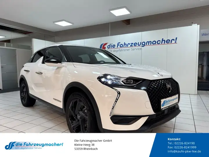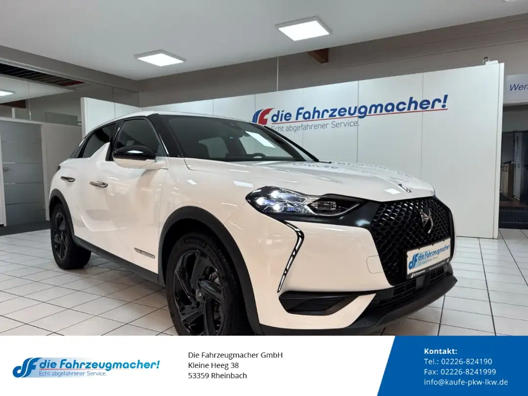 - Weiteres: Antriebs-Schlupfregelung (ASR), Reserverad als Notrad, Reifendruck-Kontrollsystem, Scheibenwischer mit Regensensor, Isofix-Aufnahmen für Kindersitz an Rücksitz, Seitenscheiben hinten und Heckscheibe dunkel getönt, Sonderlackierung Polar-Weiß, Außenspiegel elektr. verstell- und heizbar, beide, Mittelarmlehne vorn, Getriebe für Elektrofahrzeug, Sitz vorn rechts höhenverstellbar, Sitz vorn links höhenverstellbar, Einparkhilfe vorn und hinten, Kühlergrill Schwarz (DS Wings), Fzg. ohne Induktionsladeschale für Smartphone, Ablagetasche an Vordersitzlehnen, Einstiegsleisten (verchromt), Audio-Navigationssystem: DS Connect, Scheinwerfer DS LED Vision, Zentralverriegelung / Startanlage Keyless System, LM-Felgen 7x18 (Monza), Airbag Fahrer-/Beifahrerseite, Fensterheber elektrisch vorn, Seitenairbag vorn, Kopf-Airbag-System, USB-Schnittstelle, Innenspiegel rahmenlos mit Abblendautomatik, Heckleuchten LED, 3D-Optik, Außenspiegel anklappbar, beide, Advanced Safety-Paket, aktiver Spurhalteassistent (Lenkunterstützung), Akustischer Fußgängerschutz, Auffahrwarnsystem mit Bremsfunktion, Außenspiegel mit Umfeldleuchte, Außenspiegel Schwarz, Spiegelfuss schwarz, Ausstattungs-Paket: DS Inspiration Performance Line, Ausstattungs-Paket: DS Sensorial Drive, Berganfahrhilfe, City-Notbremsfunktion (Active City Brake), Coming Home, Leaving Home, DS Connect, Einschaltautomatik für Fahrlicht, Elektromotor 100 kW (cont. 57 kW), Elektron. Stabilitäts-Programm (ESP), Fensterheber elektrisch vorn und hinten, Freisprechanlage Bluetooth, Frontkollisionswarnung mit Fußgänger- und Fahrraderkennung, Geschwindigkeits-Begrenzeranlage, Klimaautomatik, Ladekabel mit Schukostecker, Lederlenkrad, Notruf- und Assistance-System (DS Connect), Parkbremse elektrisch, Pedale Aluminium, Polster: Alcantara / Stoff, Safety-Paket, Sitzheizung vorn, Spurassistent (AFIL), Totwinkel-Assistent, Verkehrszeichenerkennung, ZV mit Fernbedienung