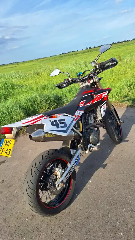 A2 Supermotard in de verkoop, omdat ik aan het sparen ben voor een A motor om ermee naar een ander continent te rijden. De Husqy maakt een heerlijk geluid met de Arrow uitlaatsysteem. Heeft elektrische start en de LED koplamp (met blauwe Halo angel dagverlichting) van een Husqvarna 701. Ook zitten er Supermotard soft tyres bij (semi-slicks). Er zitten Brembo remmen op.