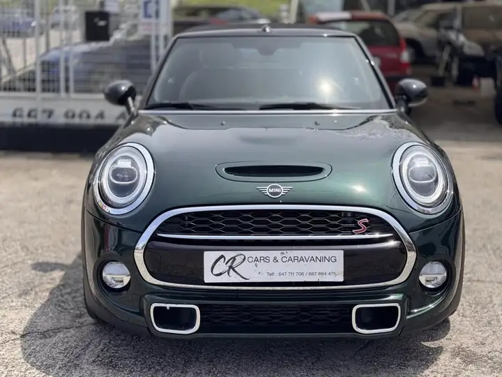 Mini Cooper S Cabrio. Verde británico con un interior en cuero marrón que parece sacado de un club privado de Londres.