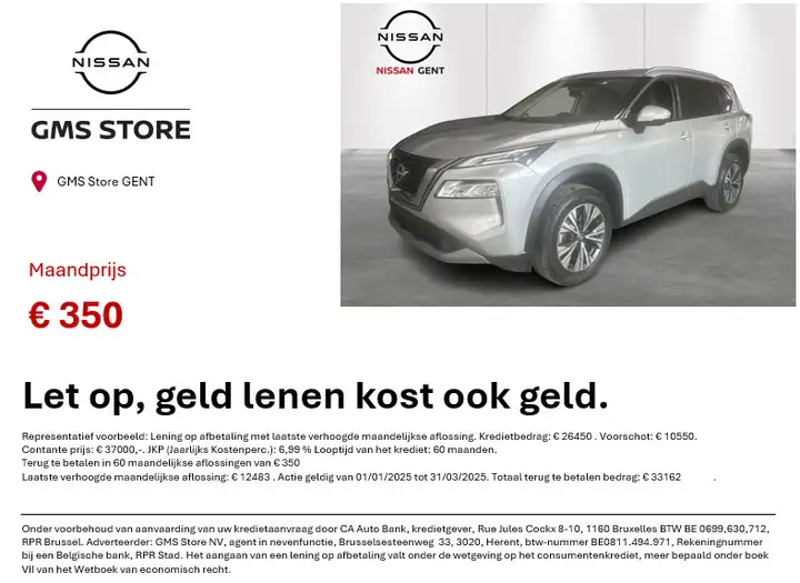 Deze wagen staat op jou te wachten in onze Nissan showroom te Gent! Heb je vragen of zin in een proefrit? Neem contact met ons op via 📞 09 266 16 60 of stuur een berichtje naar 📧 nissan.gent@gmsstore.be. Vergeet niet te informeren naar onze interessante financieringsmogelijkheden. 💡 Let op: geld lenen kost ook geld!