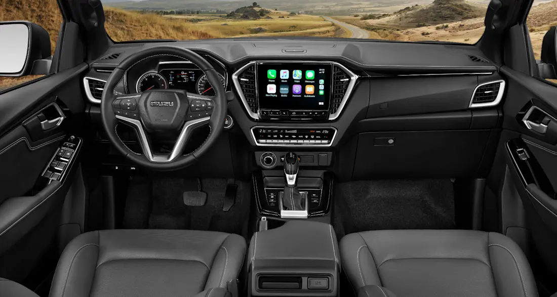 Binnen heeft Isuzu een poging gedaan om het harde, zwarte plastic zachter te maken, maar helemaal tot op het gaatje zijn ze niet gegaan. Je kijkt naar een (semi) analoog dashboard, rechts daarvan een middenconsole met multimediascherm, groter naarmate je meer betaalt. Onder dat scherm een rij toetsen voor secundaire bedieningen (verwarming, ontdooiing). Op de middentunnel de pook en toetsen voor het offroad rijden. Stoelen en achterbank zitten prima en vooral ruim voor iedereen.