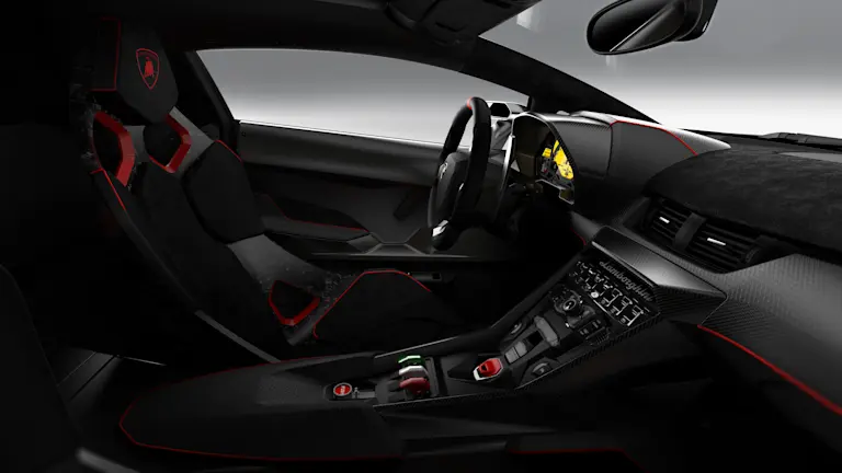 Aan boord zijn de verschillen kleiner met de Aventador, waarop de Veneno is gebaseerd. Het dashboard is grotendeels hetzelfde, maar de kuipzetels lijken rechtstreeks uit een racewagen afkomstig. Ook zie je overal carbon terugkeren in het interieur. Speciaal is het gewoven CarbonSkin, dat ook gemaakt is van koolstofvezel, maar een andere hars krijgt om soepel te blijven. Ook het interieur kon volledig naar smaak aangekleed worden, met iets meer luxe of toch een meer racy sfeertje.