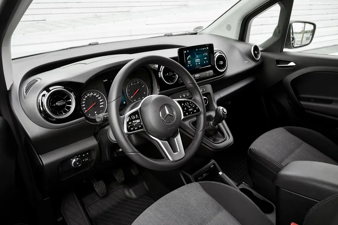 Ook binnenin heeft Mercedes meer zijn eigen identiteit kunnen creëren qua design. We zien de typische ronde ventilatieopeningen, een Mercedes-stuur en het MBUX-infotainmentsysteem (toch als je die optie genomen hebt). Onder het dashboard zijn er wel nog wat gelijkenissen met de Kangoo. Hoe dan ook zit je vrij goed in de Citan, al is er iets te weinig beenruimte voor langere mensen, en blijft het interieur ook aangenaam stil onderweg.