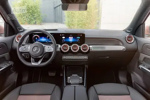 Binnenin gaat de EQB voor een digitale look met een instrumentenpaneel dat visueel lijkt door te lopen in het infotainmentscherm. In de hogere uitvoeringen is dat scherm 10,25 duim groot voor een nog vloeiender geheel. Het MBUX-infotainmentscherm laat zich in deze EQB ook met de stem bedienen, en beschikt dus over een virtuele assistent die je aanspreekt met “Hey Mercedes”.