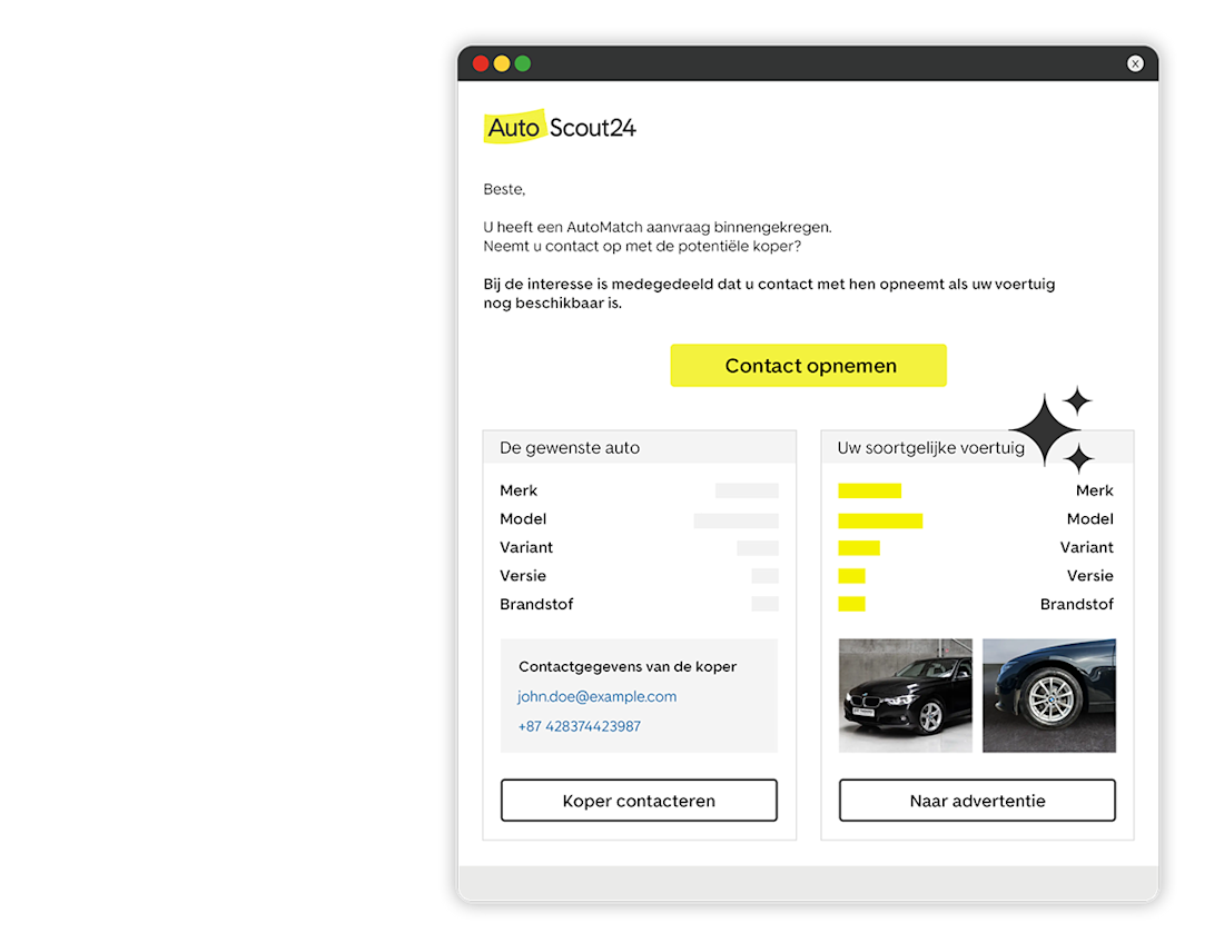 - Met toestemming van de koper stuurt AutoScout24 de contactgegevens van de koper en het overeenkomstig voertuig naar u.